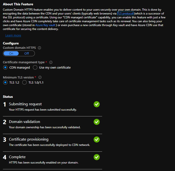 In order to use a custom domain for Azure CDN we need to create a CNAME record with our DNS provider that points from the domain (like staticsite.mydomain.com) to the domain we queried in the previous step (like cdn-ep-mystaticwebsite.azureedge.net). After that we can set the custom domain on the Azure CDN profile. After that we can add the custom domain to the Azure CDN profile.